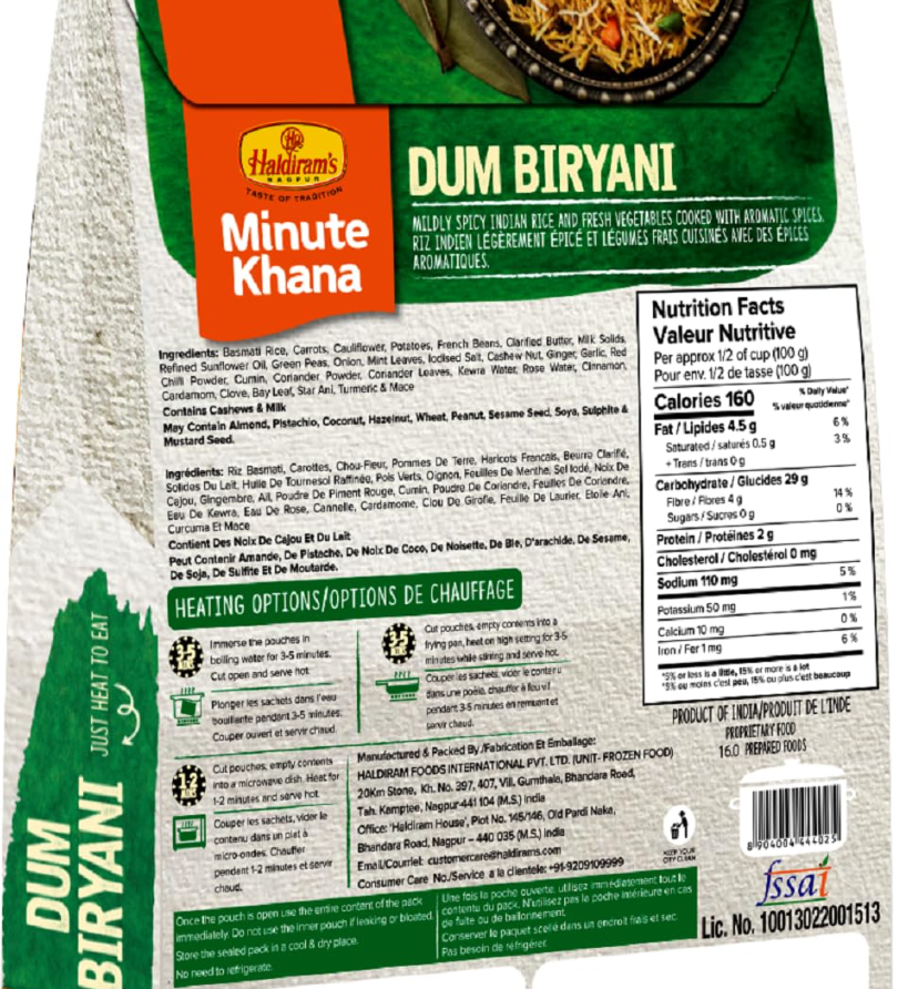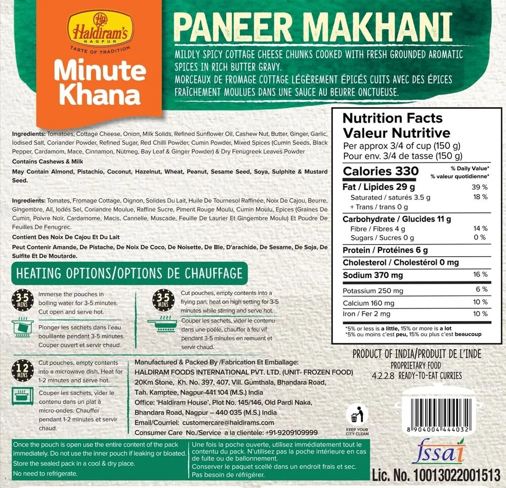 인디언 코티지 치즈, 크림, 해바라기 오일, 양파, 생강, 토마토, 마늘, 캐슈넛(알러겐), 데기 미르치, 시나몬, 라지, 소금, 카다멈, 고수 가루, 설탕, 커민, 설탕, 스몰 카다멈, 메이스, 말린 페누그릭 잎, 말린 생강 가루, 베이 잎.