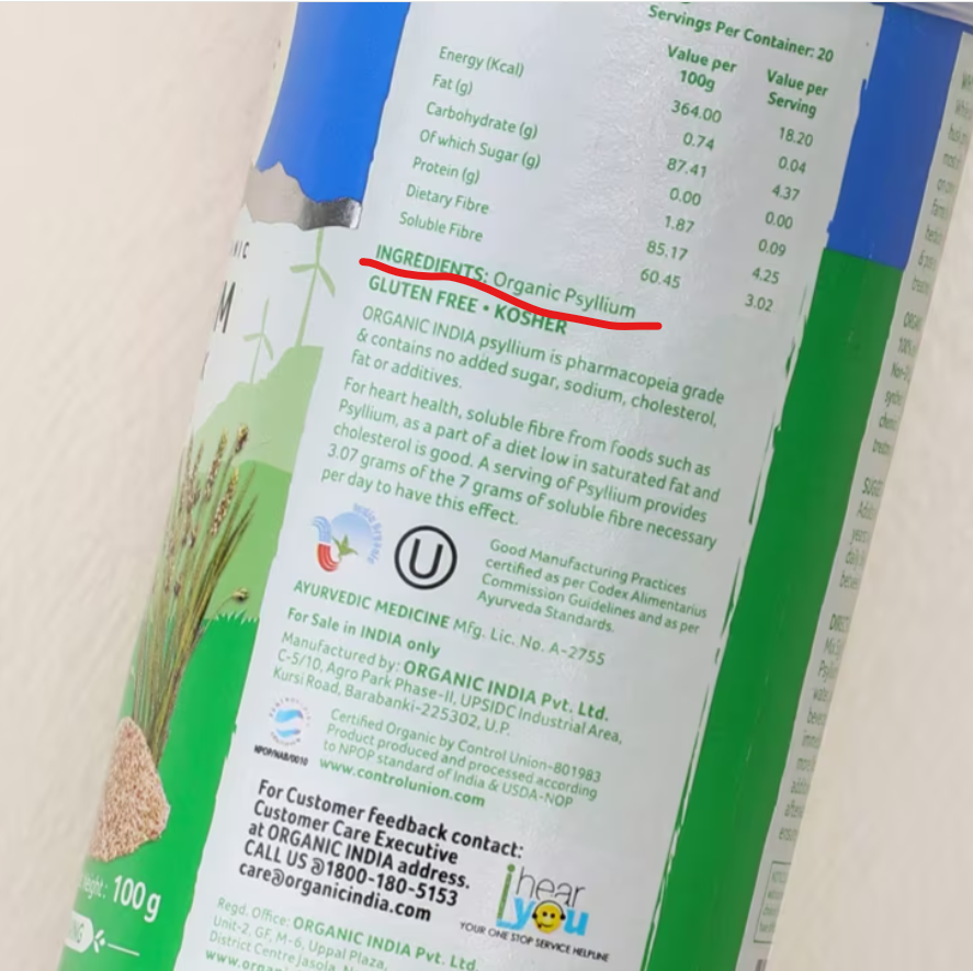 ORGANIC INDIA psyllium is pharmacopeia grade and contains no sugar sodium, cholesterol, fat or additives.
