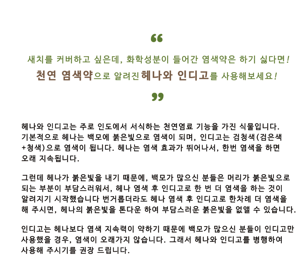 인디고를 함께 사용 해주시면 보다 자연스러운 새치 염색이 가능합니다