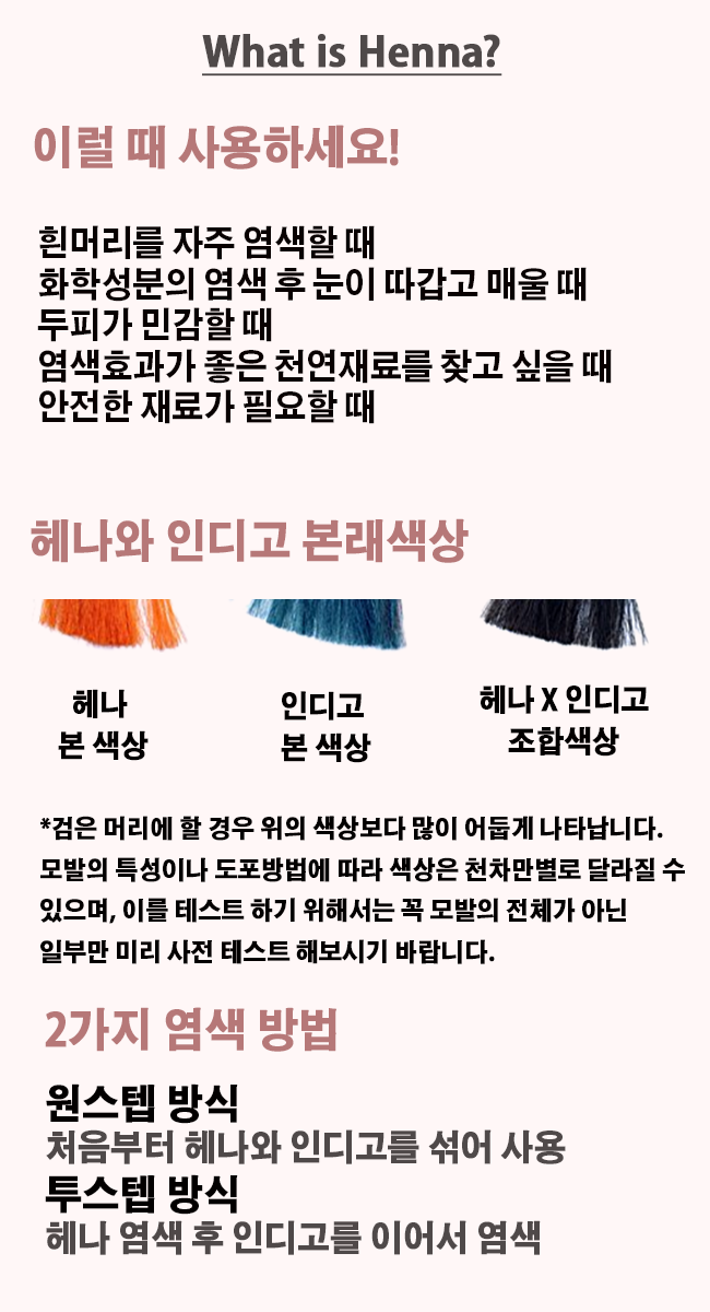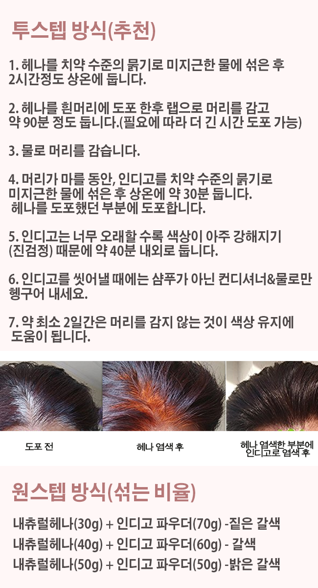인디고를 함께 사용 해주시면 보다 자연스러운 새치 염색이 가능합니다